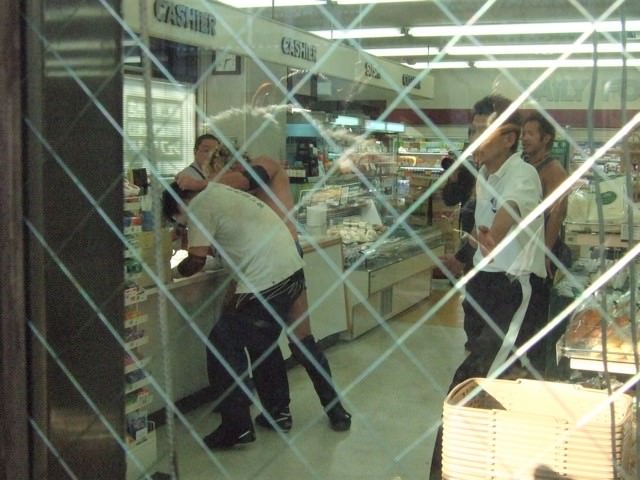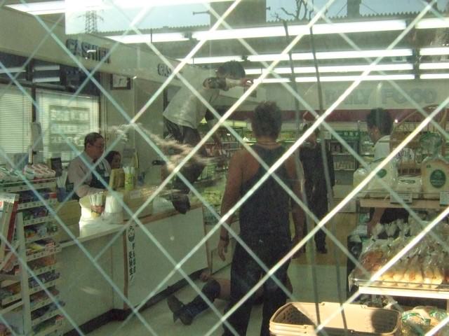 Yup, he’s all happy, but it ain’t over yet, because DSL calls for an immediate rematch. Michael and Kenny try to run away from him, ducking into a convenience store that sells bread and bentos. Kenny attempts to hide among the shelves while Michael trys to look natural, browsing the merch, all while the crowd is still outside watching the whole thing through the windows.