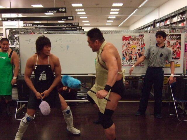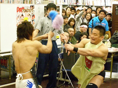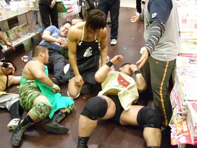 March 7: Bookstore wrestling!! Yes, DDT managed to find a mall that had a bookstore willing to let a bunch of crazy wrestlers tear the place up for the day. Of course king of street wrestling Ibushi participated.