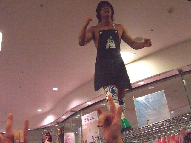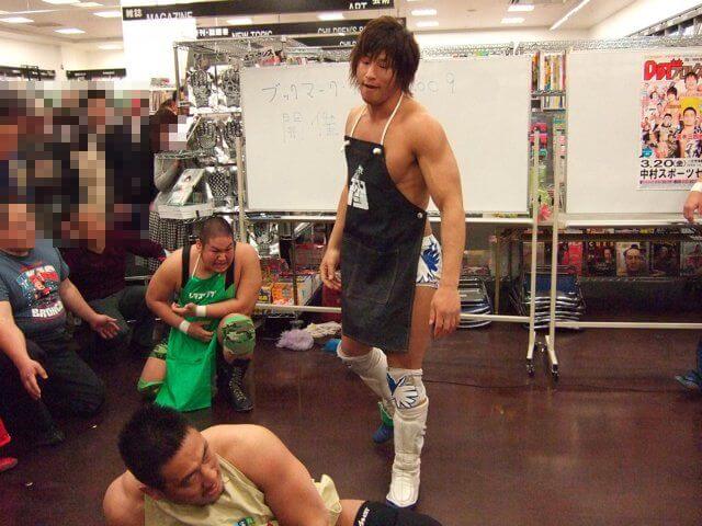 Ibushi manages to wear a sales clerk apron the entire time, which I appreciate.