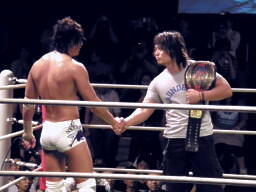 Ibushi thanks Takagi for postponing the match, and apologized to the crowd for the delay.