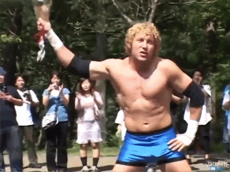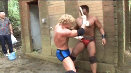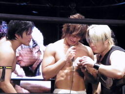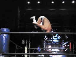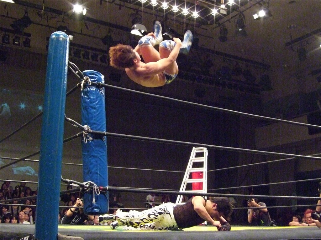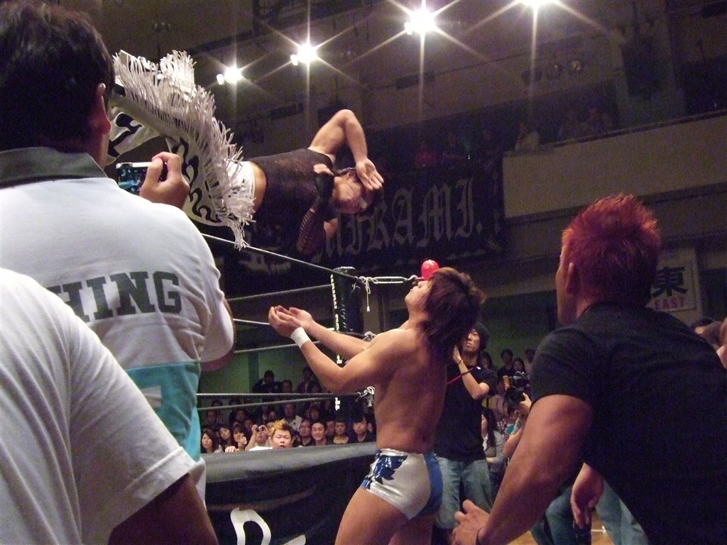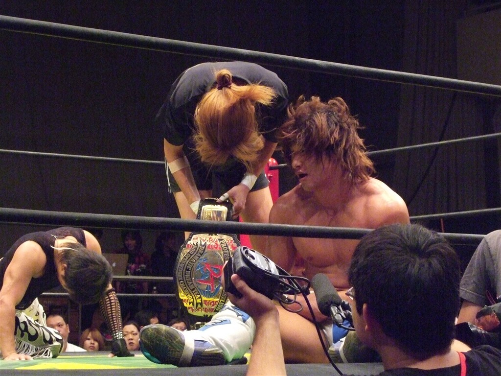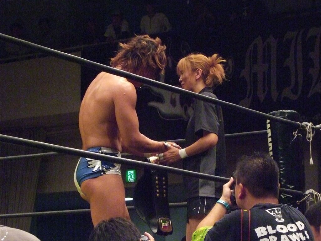 After the match, Ibushi pulls his written promo out of his shoe. He beings reading the wrong thing: “On the way home from the disco, muttering that this is the end of youth…” Matsui interrupts by smacking Ibushi in the head and handing him the correct promo. According to Extreme Party, “After regaining his composure, he said once again, ‘Thank you for coming today, everyone in Osaka. I will be back in Osaka as a champion. I would like to close the usual way: three, two, one, the end. The end. The end. The end. And do a backflip. Let’s go” He then does a number of backflips in the center of the ring before backflipping off the apron.