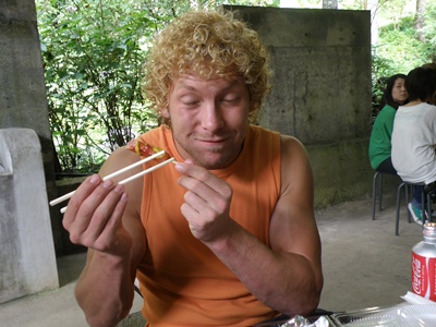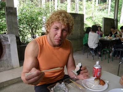 September 8th Ibushi, Kenny, Oya, Ihashi, and Ozaki-san went to the nearby Sakura Suisan for dinner. The next day Ibushi had a meat based meal with one of the concession stand workers.