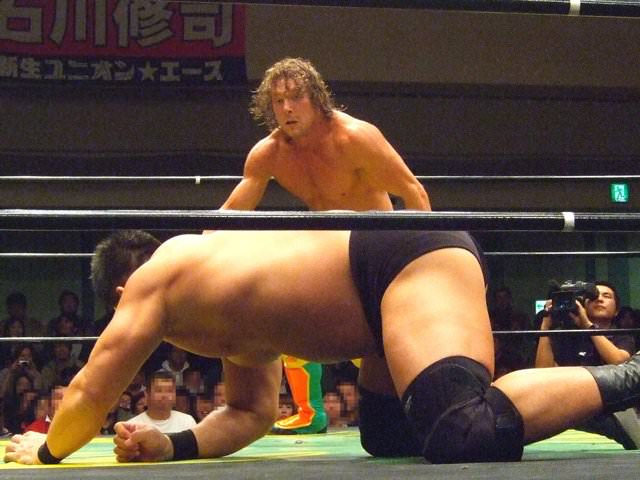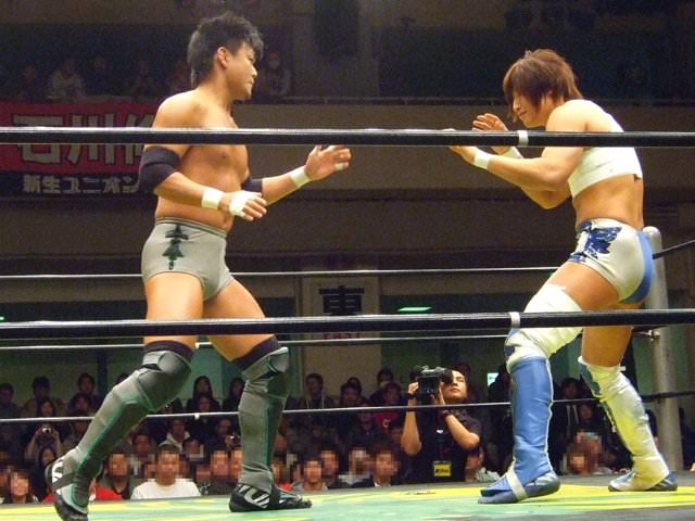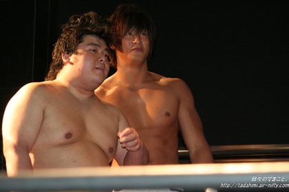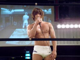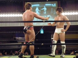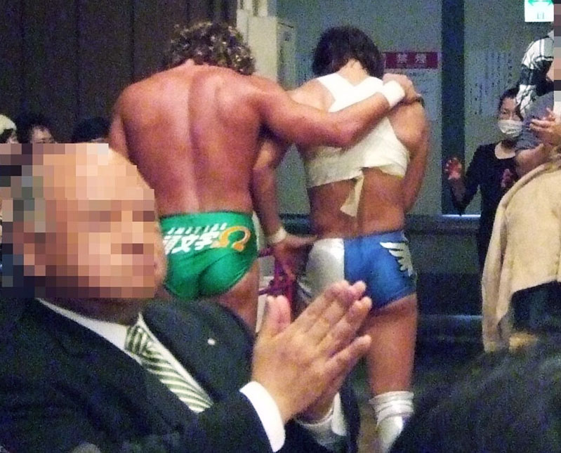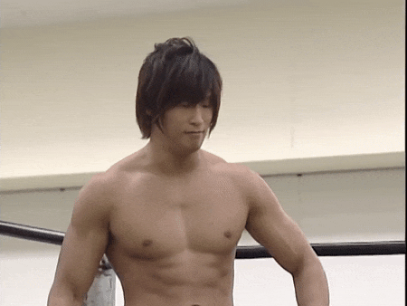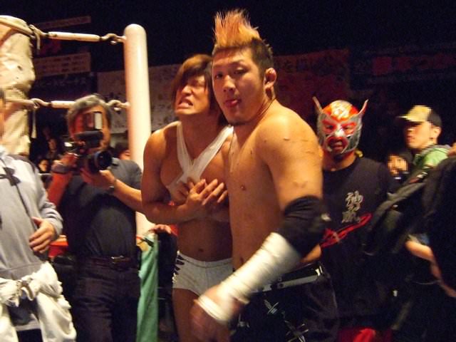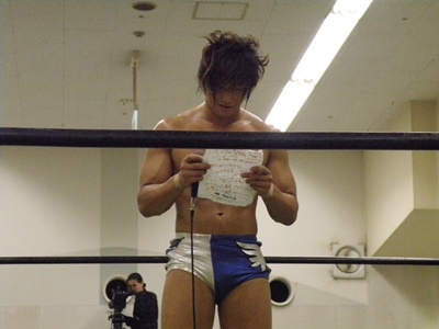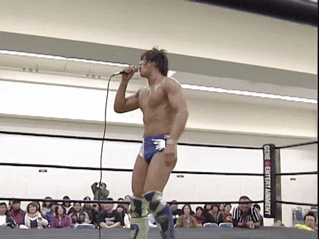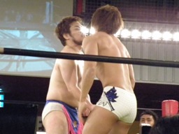 In his usual fashion, Ibushi closes out the show with a promo read from a piece of paper, only this time when he looks for his promo stashed in his boot he can’t find it. Nakazawa pulls a piece of paper out of his tights (yum) and gives it to Ibushi, who reads in English, “I love Hakata very much. I love Motsu-Nabe very much. My hobby is playing games and having sex….”