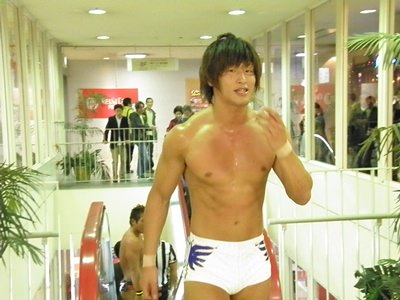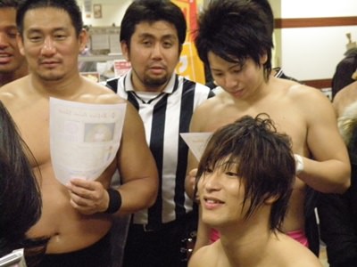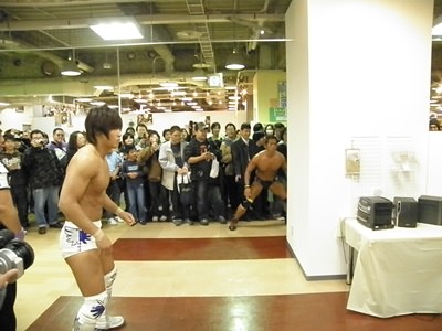 After the show is over, the wrestlers pose for some pictures for reporters, then huddle around a special machine (that seemingly no longer exists, yes I looked it up to find out) that supposedly reads your aura and provides a report. You know, one of those weird things you find yourself doing in a large mall. The report for Ibushi said he is “noted for his strong sense of responsibility and kindness.” Aw, that’s nice. I’ll go out on a limb and say probably accurate too.