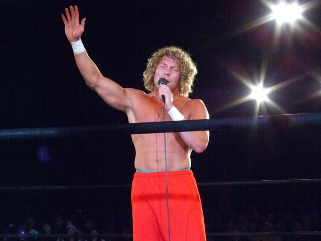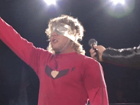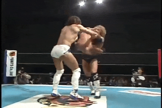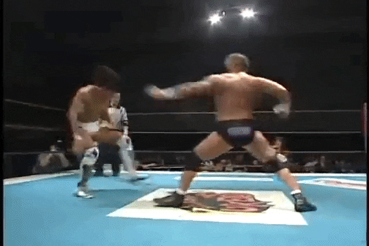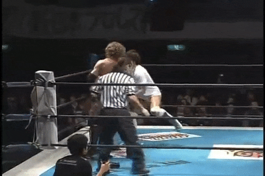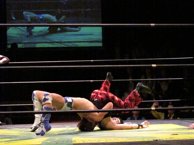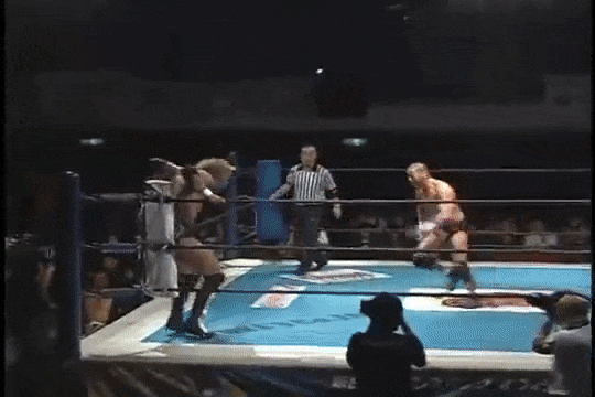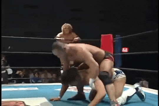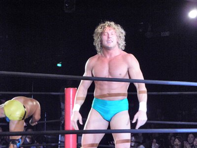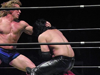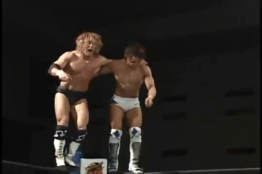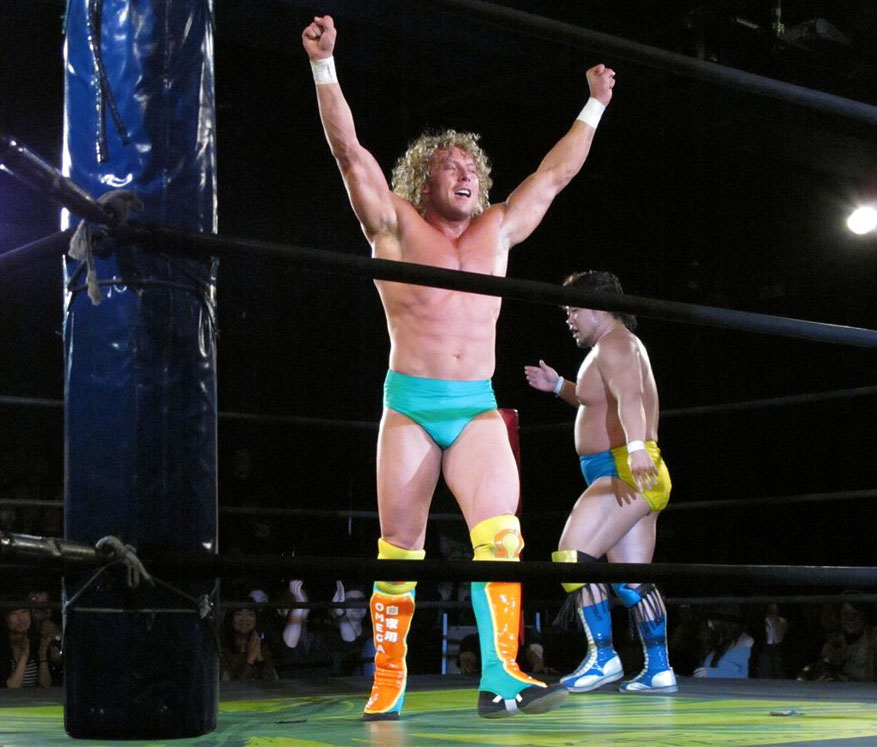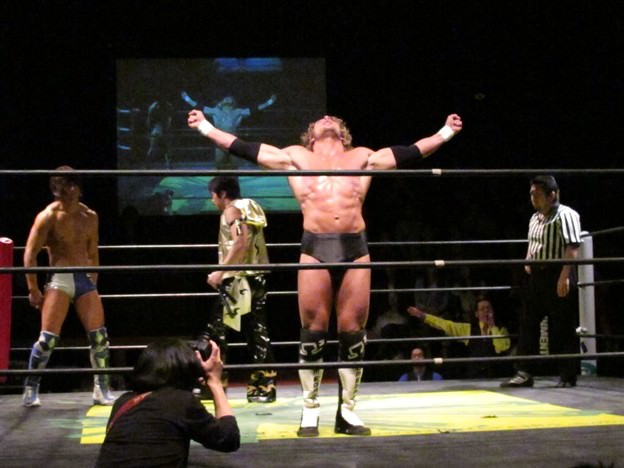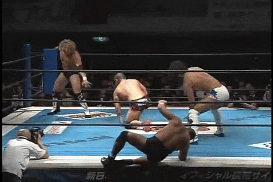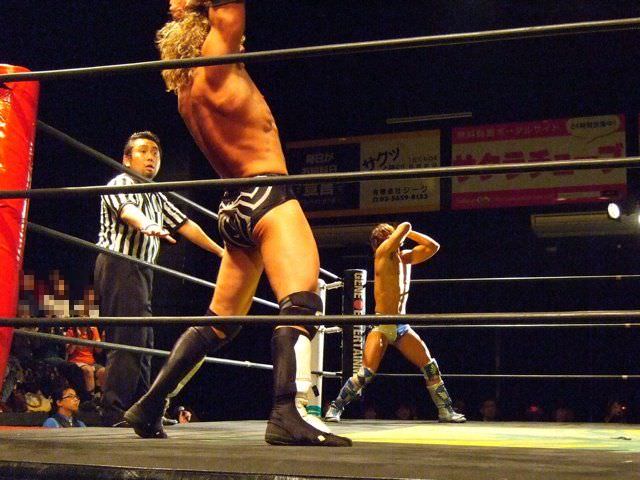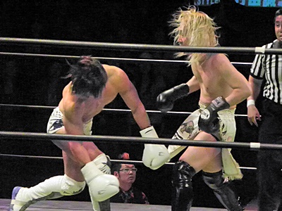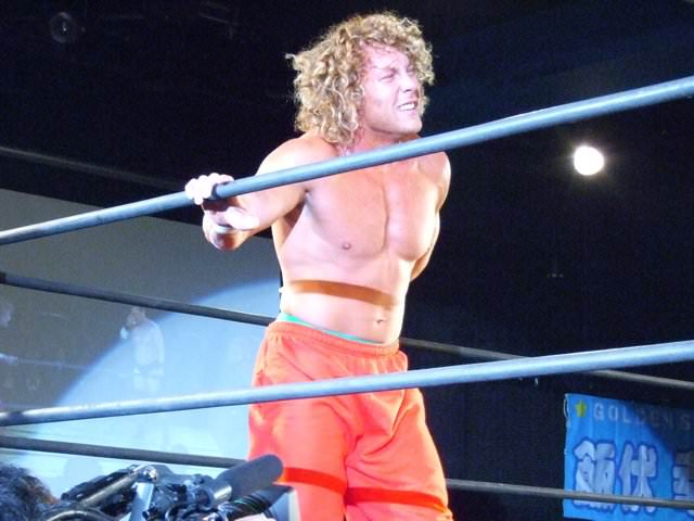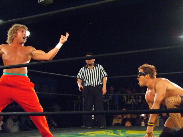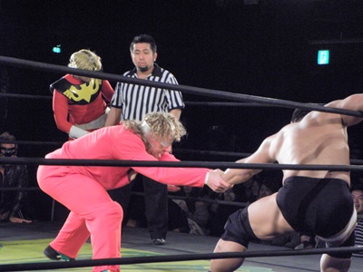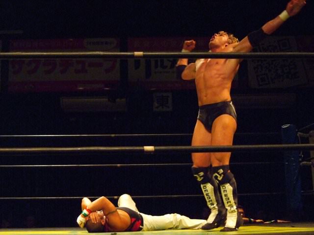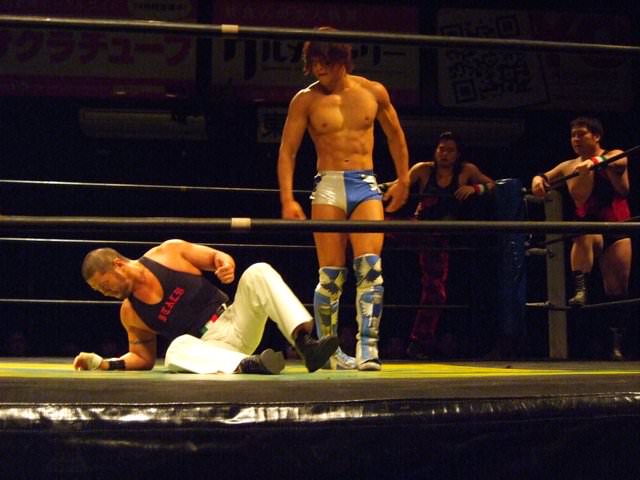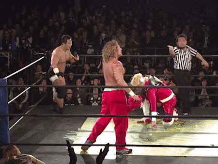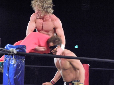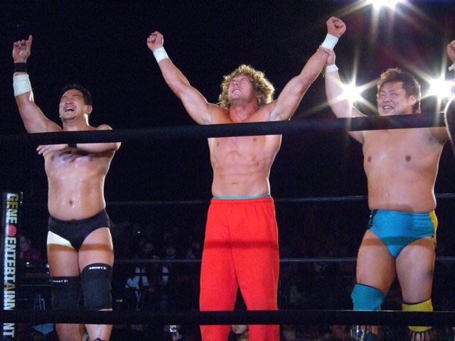 Kenny had a rather strange six-man match of his own, coming out to the ring blindfolded, hair in full floof mode, and going by the last name “Aznable.” He and teammates Nakazawa and Yoshiaki Yago defeat opponents DJ Nira, Sanshiro Takagi and Tomomitsu Matsunaga in just over 8 minutes of shenanigans.