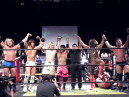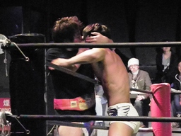 May 30th: The Golden Lovers are together in a twelve-man tag match at King of DDT 2010. I won’t bother to list all involved in that match, because its half the DDT roster. I do like that the Lovers manage to celebrate their team’s win by standing next to each other and holding hands at the end. Seems a fitting way to end the month of May.