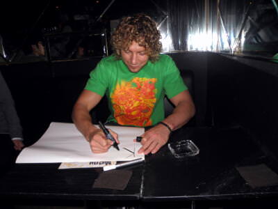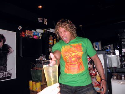 Kenny encourages people to buy his shirts, and makes a drink for guests he calls the Golden Shower, in honor of the Golden Lovers’ signature tag team move. The drink is bright yellow (of course) and consists of vodka, lemon juice, lime syrup, and banana liqueur mixed with soda water. It was reportedly quite sweet. 🙂