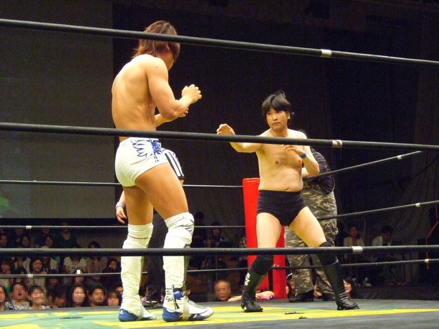 The match had been highly anticipated when it became the main event, and it lived up to those expectations. Needless to say, this was the best bout of the day. In the beginning, Kenny was a little rough, and his own moves drove him into a corner, but Kenny, who could not make up his mind, was gradually drawn into Hayato’s territory, and in the end, Hayato won the match after a fierce exchange of blows. Hayato was a little bit more concerned about his knees than usual, but he was able to withstand Kenny’s powerful attacks and pull himself together to win the match. In the beginning, many people cheered for Kenny, but it was impressive to see the audience cheering and clapping for Hayato the moment he won.